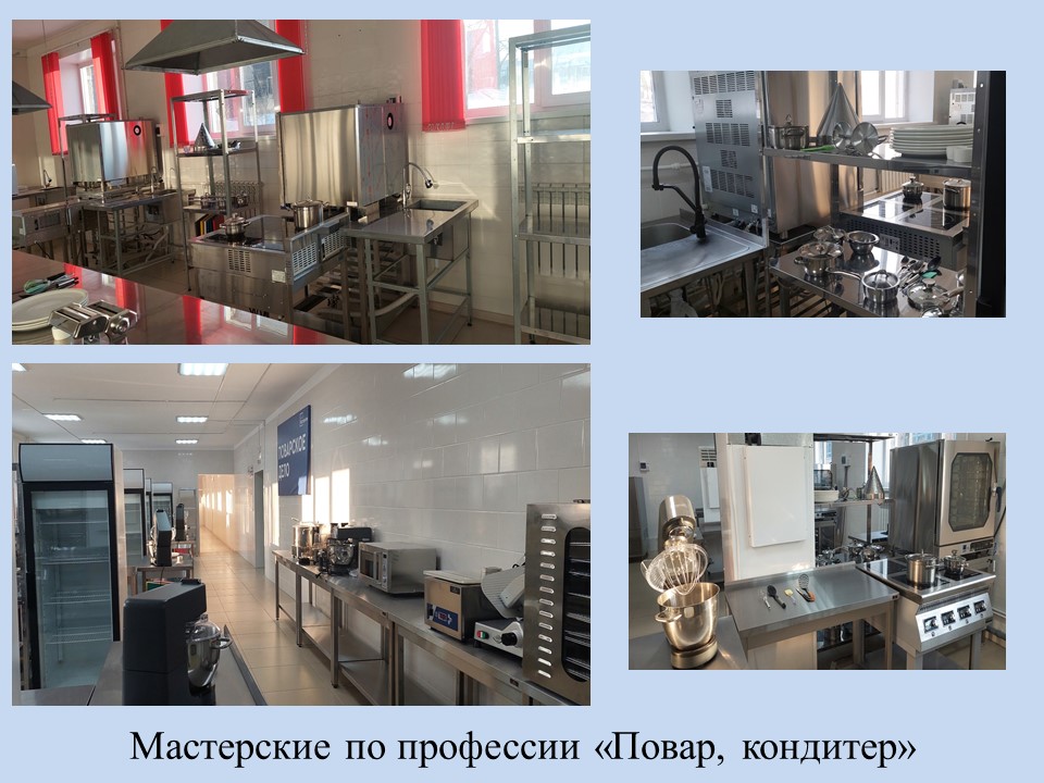 Для обучения по профессии СПО 43.01.09. «Повар, кондитер» оборудована лаборатория, кондитерский цех, мастерская, созданная за счет средств федерального бюджета на 5 рабочих мест, мастерская, созданная за счет собственных средств на 3 рабочих места.